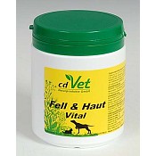 cdVet Fell & Haut Vital je čistě přírodní bylinná směs, určená k intenzivní podpoře organismu psů a koček při problémech se srstí a kůží. Tyto problémy mohou být vyvolány stresem nebo nedostatkem živin, velice časté je také přehlcení organismu syntetickými látkami, jichž se tělo obtížně zbavuje. Tento produkt obsahuje speciální byliny, kvasnice, esenciální mastné kyseliny, mikroživiny, stopové prvky a vitamíny pro podporu detoxikačních orgánů (játra, ledviny) a imunitního systému; pomáhá vyrovnávat deficity organismu způsobené stravou a podporuje detoxikaci, látkovou výměnu a čistí krev. Směs je vhodná při šupinaté a suché kůži, při lámání srsti, při svědění, ekzémech a alergiích. Zásobování vitamíny, stopovými prvky, aminokyselinami a vybranými bylinami podporuje fyziologické funkce orgánů, procesy látkové výměny a tím zajišťuje zdravou kůži a lesklou srst.
